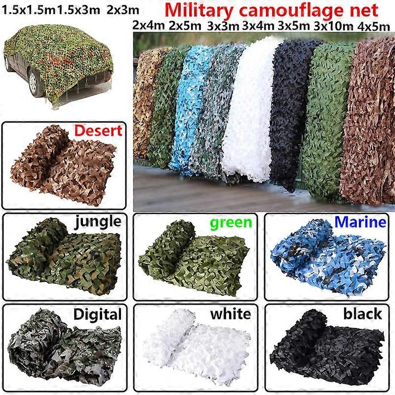 Welcome to our shop! 1.5mx1m 1.5mx10m 3x4m 4mx5m Military Camouflage Netting Hidden Net White Blue Beige for Desert Hunting Outdoor Garden Canopy Canopy Product Name: Camouflage Net Material: 210D Oxford Polyester Cloth (The quality is better than 150D Oxford cloth from other sellers) Color: jungle/desert/digital/black/white/green/blue Package included: 1 double layer camouflage net Characteristic: -100% brand new and high quality. -Military Camouflage Net: There is a sling for each meter, so you can easily hang it. We have sewn and reinforced the edges of the camo net so that the camo net has a longer service life and is easier to use. -Camouflage is very effective, with realistic effects and versatility. Main Function and Purpose: -Military camouflage training, anti-infrared radar for military installations. -Aerial photography of air defense land for real estate companies. -Anti-satellite photography of illegal buildings and plants. -Parks and other public places blur the environment. -Green mountains and linings cover the garbage. -For bird watching lovers, it is necessary to shoot far and come into contact with birds in disguise. -Disguise and use a sniper war game. - Decoration and beautification (theme parks, exhibitions, movie bases, outdoor development, CS field simulation, hotel decoration, industrial decoration, home decoration, etc.) Note: We can customize other sizes as you need, if you are interested, please feel free to contact me..